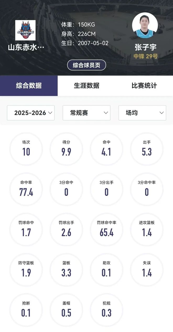 张子宇WCBA职业生涯第一个赛季的数据最后定格在了十场比赛,场均8.5分钟,得9.9分3.3篮板0.1助攻0.5盖帽1.4失误。