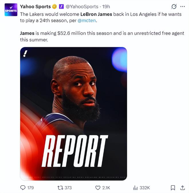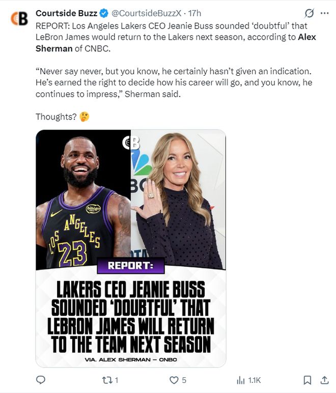 但两小时后根据,美记alex sherman的报道,湖人队CEO珍妮-巴斯觉得勒布朗‘不太可能’会在下赛季重返湖人队。虽然不能说詹姆斯绝对不会重返LAL,但珍妮-巴斯透露詹姆斯从来没有任何暗示将要重返湖人,詹姆斯对自己的职业生涯有绝对的控制权。