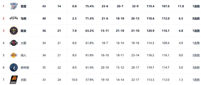 在西部前六名中,马刺豪取8连胜,他们仅仅落后雷霆2.5个胜场,并且领先了掘金4.5个胜场,西部前两位的排名比较稳定。只不过,从第四位到第六位可以称得上是“乱的一锅粥”,形成了大乱斗的局面。