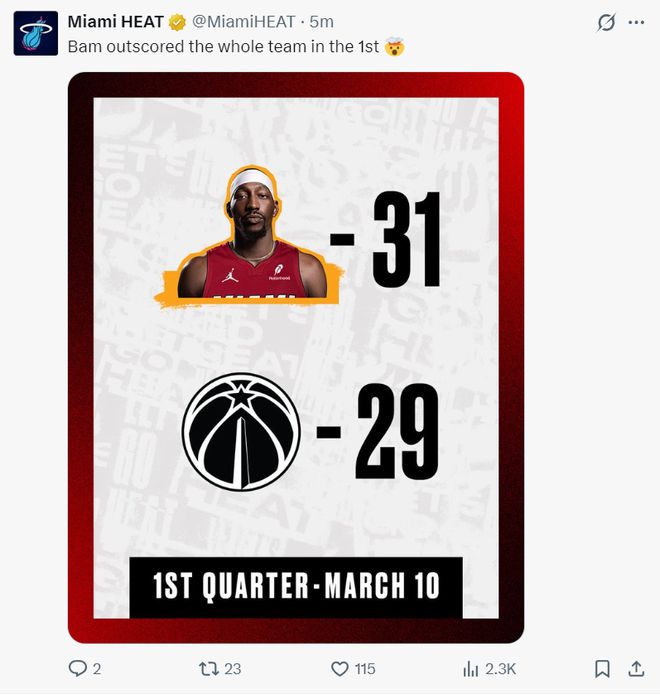北京时间3月11日,热火大胜奇才。这场比赛是阿德巴约之夜,他首节就狂揽31分一人吊打奇才全队,半场他已经拿到43分创造个人生涯新高,三节62分比肩Kobe,末节阿德巴约继续刷分拿到83分后打卡下班,超越科比成为历史第二人。