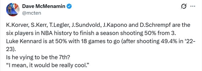 另外,NBA历史上目前只有6位曾经单赛季三分命中率达到至少50%的球员。他们是科沃尔、科尔、莱格勒、桑德沃尔德、卡波诺、施拉姆夫。肯纳德目前三分命中率50%,本赛季还剩18场比赛(他2022‑23赛季命中率为 49.4%)。他会成为历史第 7 人吗?