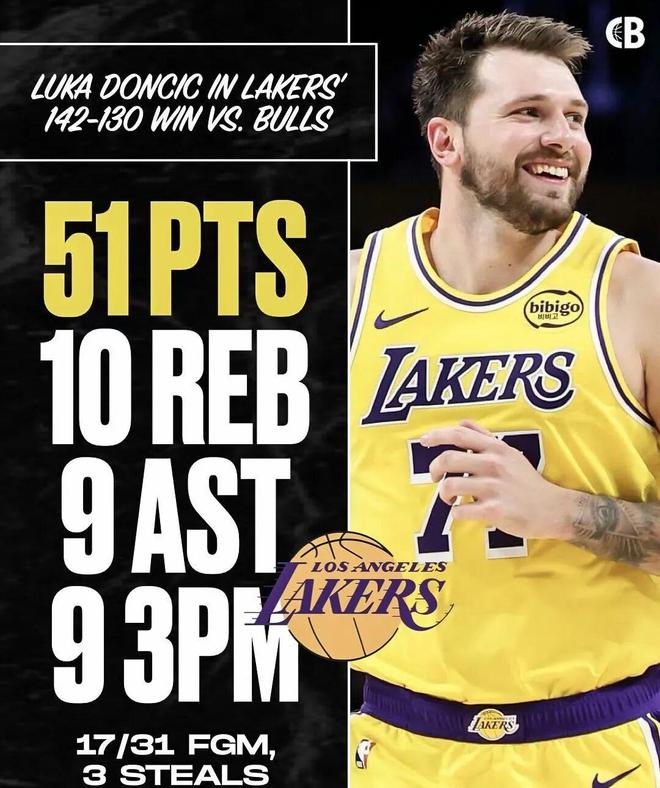 - 2026年03月13日 湖人轻取公牛!东契奇湖人生涯新高51+10+9 詹姆斯复出18+7+7