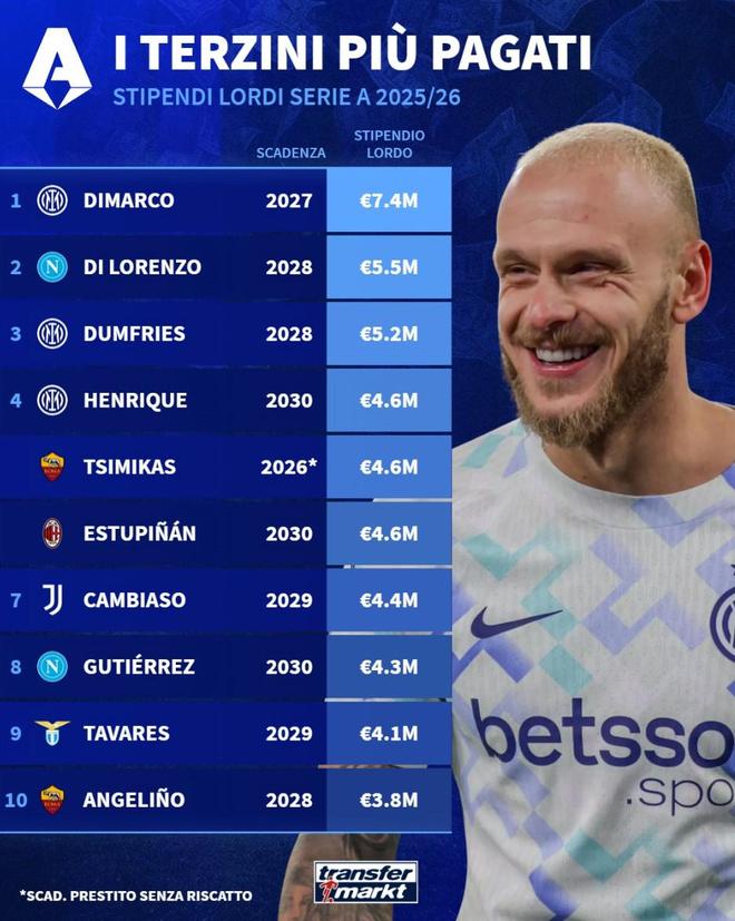 北京时间2月17日,德转统计出了2025-26赛季意甲税前工资最高10名边后卫,迪马尔科以740万欧元高居第一,迪洛伦佐550万欧元第二,邓弗里斯520万欧元第三,路易斯-恩里克、齐米卡斯以及埃斯图皮尼安同以460万欧元并列第四。