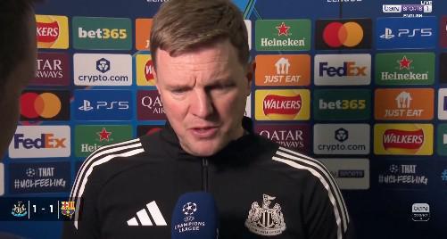 欧冠1/8决赛首回合,纽卡主场1-1战平巴萨,纽卡主帅埃迪-豪赛后接受了拜因体育的采访。